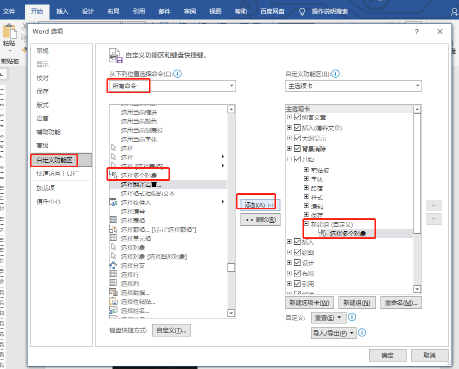 2.然后再次点击【文件】-【选项】-【自定义功能区】,先选择【所有命令】,再找到【选择多个对象】,选中后点击【添加】到右边的自定义功能区。