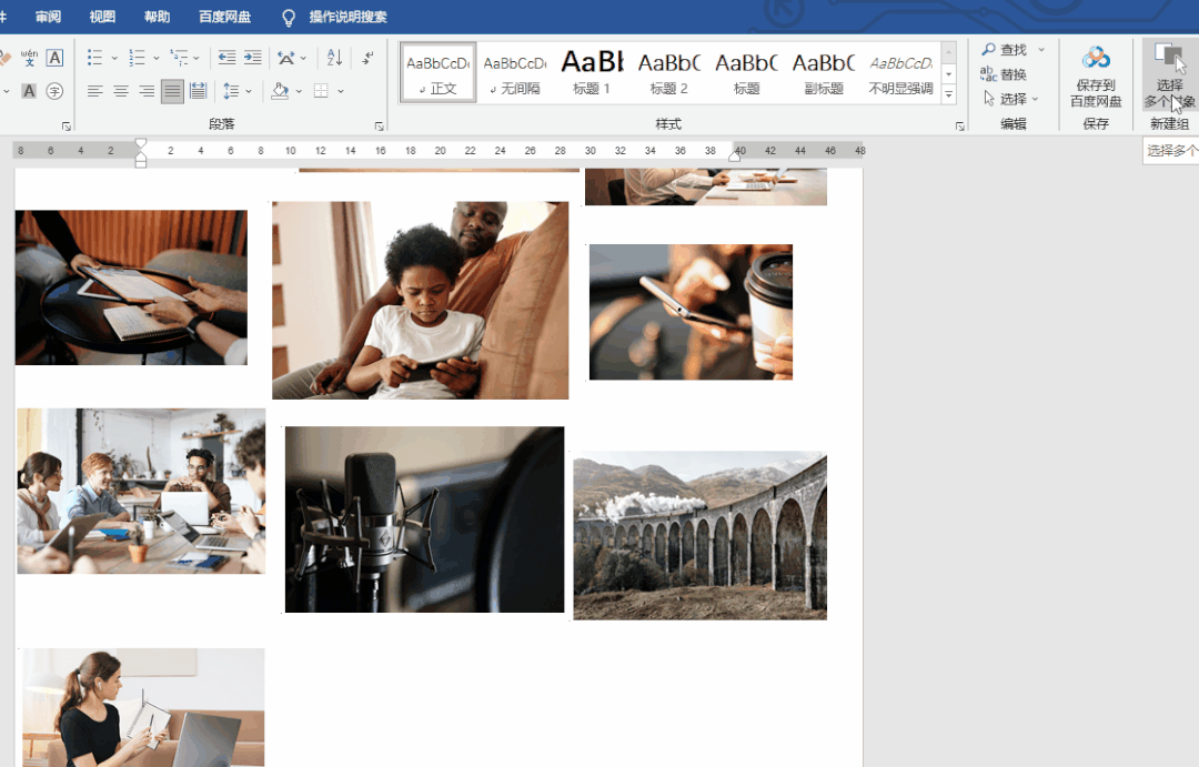 4.最后我们就可以一键批量修改图片大小了,在Word文档里插入大量图片,点击【选择多个对象】快捷按钮,右键图片【设置自选图形/图片格式】,修改图片高度、宽度,点击【确定】,图片尺寸瞬间统一。