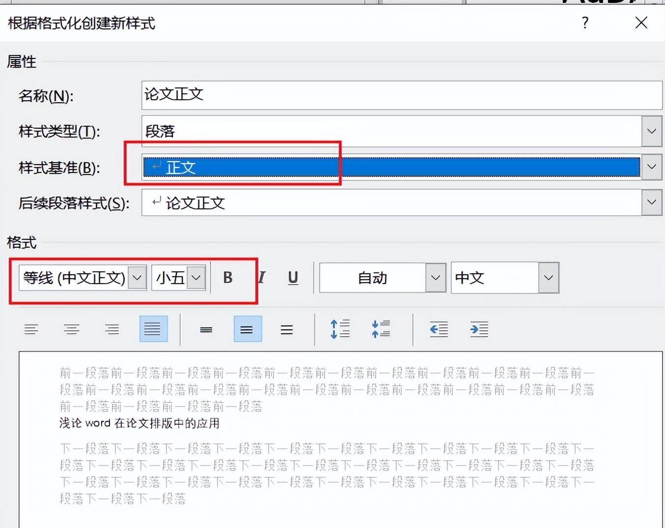 这里还需要注意的是,把【论文正文】样式新建好后,我们还需要把使用到的标题类样式的【后续段落样式】更改为【论文正文】,这样在标题回车后,就自动切换为论文正文的样式了。