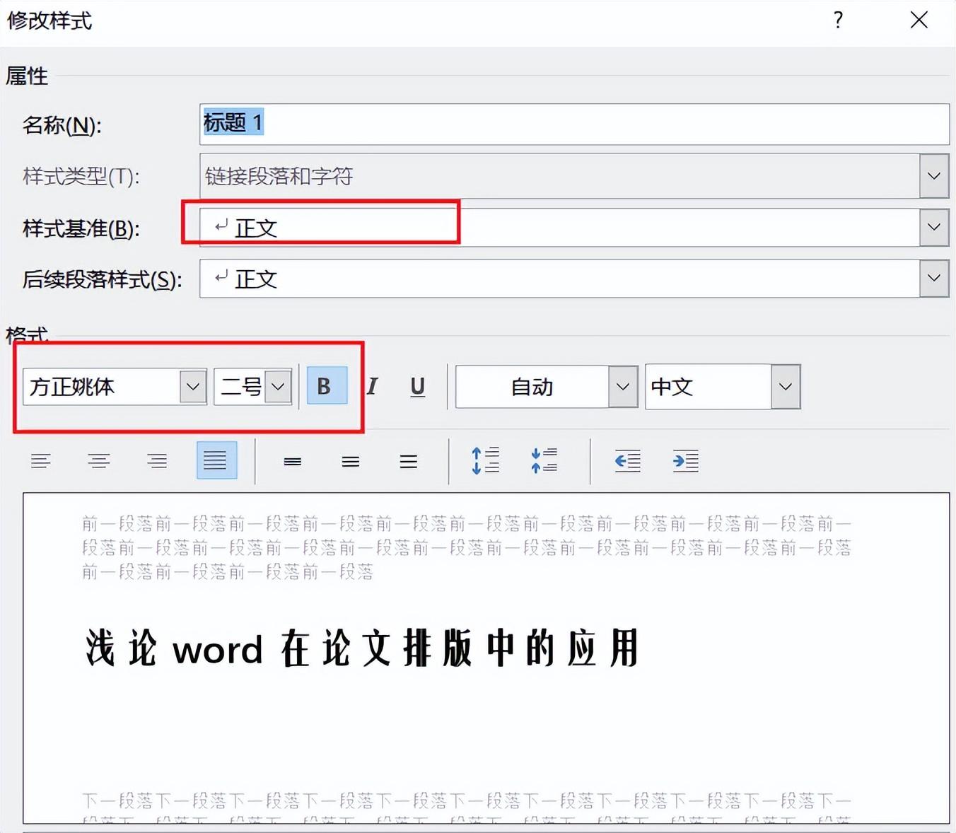 如果更改word文档基准样式的格式元素,则所有基于样式基准的其他样式也将相应发生更改。默认的【标题一】的样式基准是【正文】,如果我修改【正文】的字体为方正姚体,打开【标题一】的样式面板,它的字体也随着正文变成了方正姚体。
