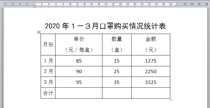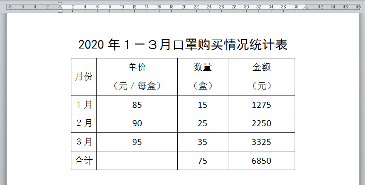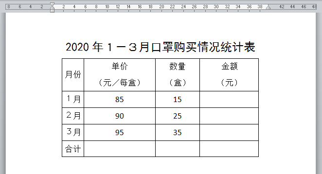 下图文档中有一张2020年1-3月口罩购买情况统计表,数据量并不大,我们想不动用excel表格进行统计,直接利用WORD自带的函数公式计算出表格内空白单元格的数值。其中,金额=单价*数量。