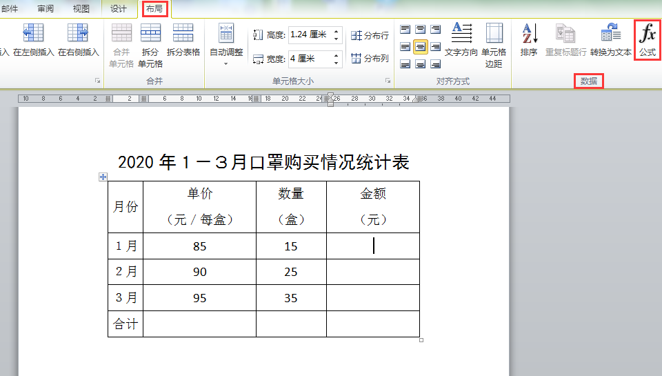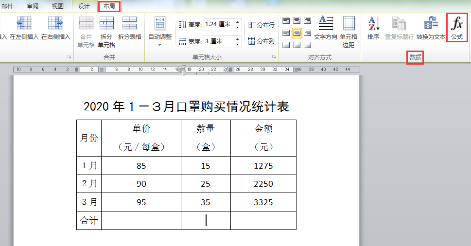 4、接下来在“合计”行对1月-3月的“数量”、“金额”两列进行求和计算。如下图所示,将光标定位在"合计"行对应的数量单元格,在[布局]选项卡[数据]功能组中点击[公式]按钮。