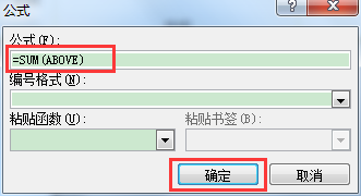 5、弹出的[公式]对话框中公式编辑栏默认显示"=SUM(ABOVE)",直接单击[确定]按钮。