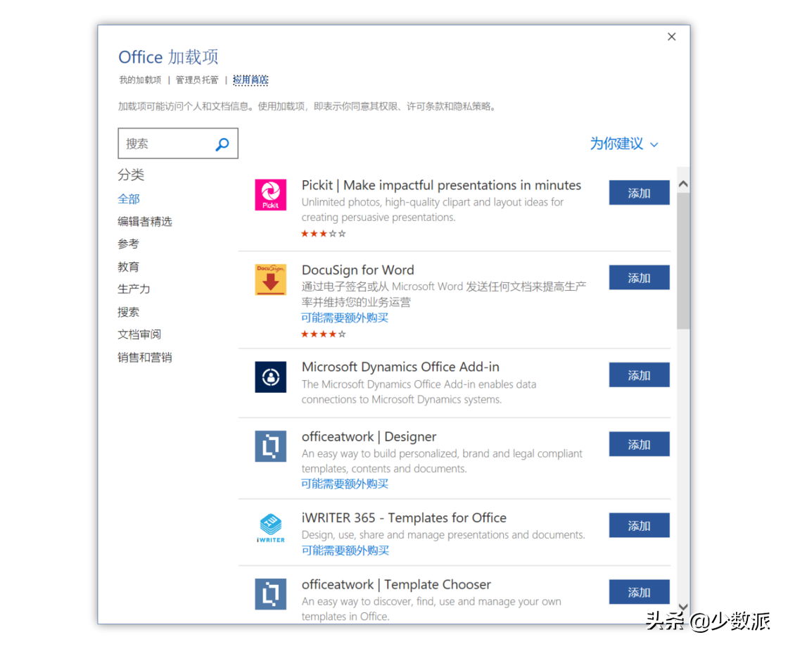 在 Office 应用中下载的插件会随你登录 Office 时使用的微软账户同步,一处下载,处处安装。点击「获取加载项」,我们就可以看到 Office 插件商店,在这里我们就可以直接搜索下文推荐的插件,并直接安装到本机 Office 应用之中。