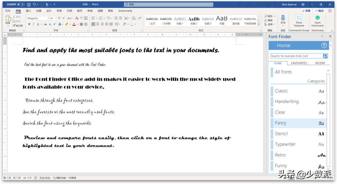 Font Finder 也是由微软官方发布的字体插件。这个插件直接集成了很多有趣的英文字体,分为经典、手写、清晰、华丽等七类,供我们选择。就算我们电脑本身并没有安装这个字体,Font Finder 插件也可以帮助我们直接使用这个字体。不过,遗憾的是,Font Finder 里面集成的字体几乎都是英文字体。也就是说,很多华丽的中文字体,我们并没有途径直接用 Font Finder 使用。