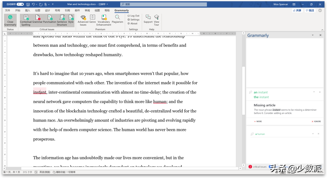 Grammarly 也肯定是考虑到,使用 Word 编写排版论文文献的同学太多太多,于是也为 Word 开发了 Grammarly 的集成插件。这个插件让我们在写英文文章的过程不再焦虑语法问题,其自动修错功能不仅能够为你错误的地方下方标红,还能够告诉你错误的具体原因,以及建议的修改方法。而上面这些仅仅是 Grammarly 的免费账户就有的功能,付费的 Grammarly 账户甚至还可以帮助你将文章更深程度的润色,寻找更好的表述方式、同义词、使用语法等等。可以说是撰写英文文章的神器。