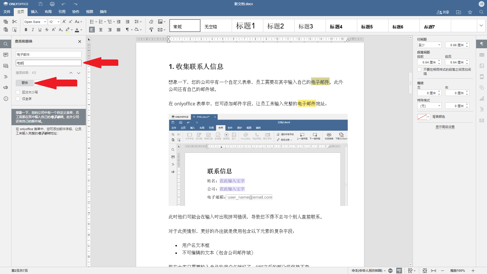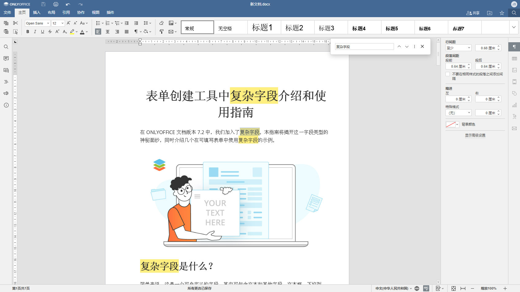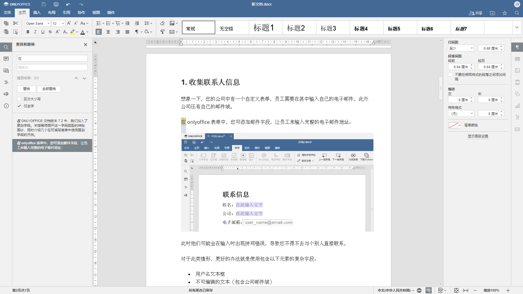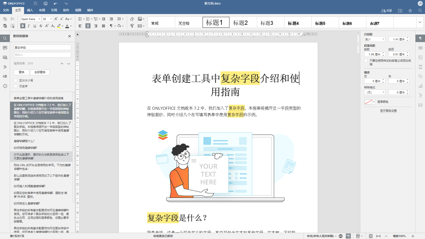 ONLYOFFICE 文档版本 7.2 引入了一个全新的搜索栏。现在,用户可以在文档中更轻松地查找内容,输入更多选项,还可以在结果中导航。我们来看看如何在Word文档中查找和替换文本。