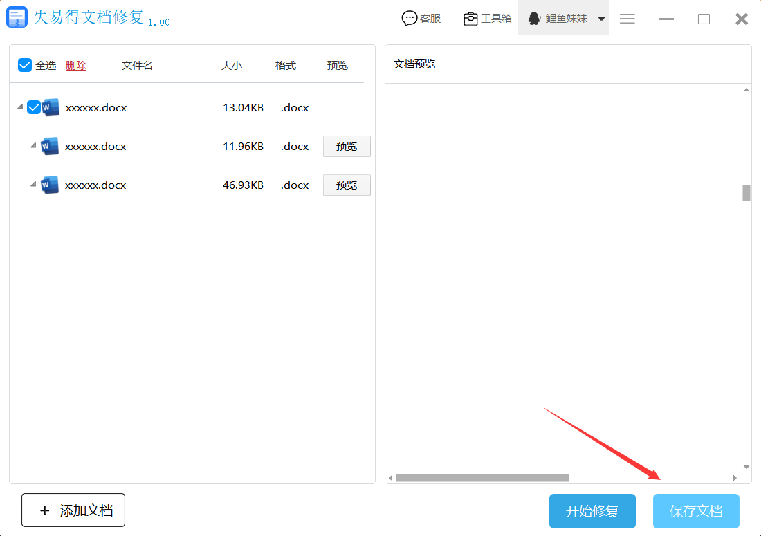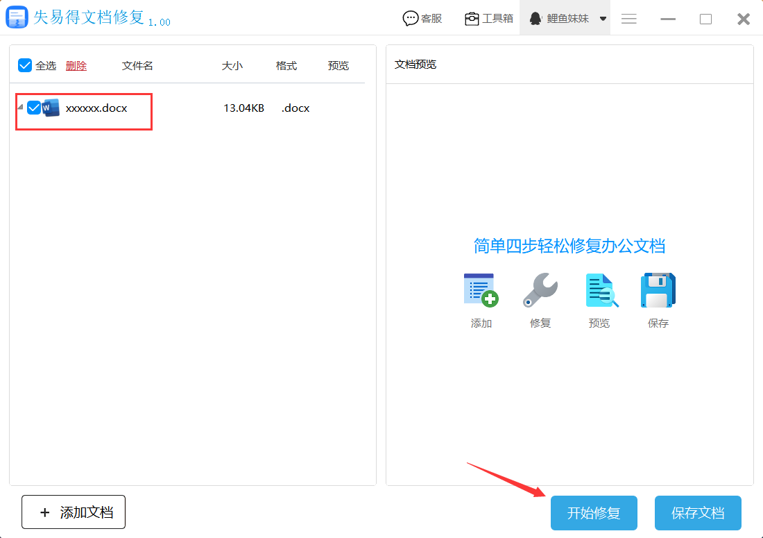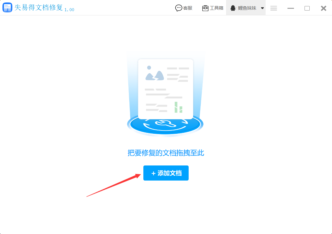 第一步:下载安装好失易得文档修复软件,打开软件,把工作中,损坏的文件拖到软件内或者点击“添加文档”进行添加。