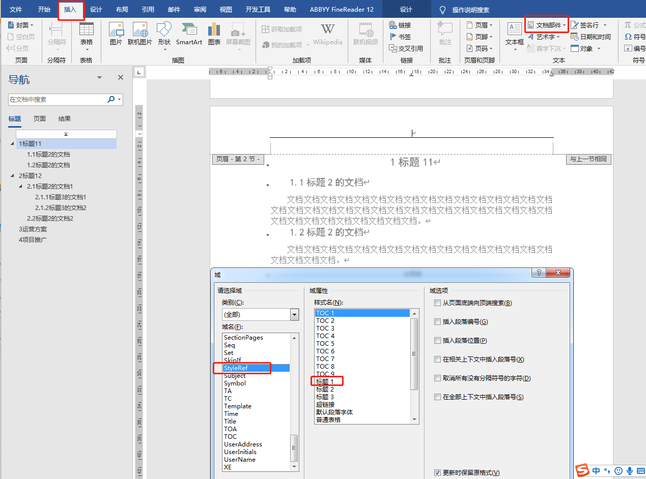 双击页面上端进入到页眉设置状态后,点击菜单栏中的插入——文档部件——域,将左边的域名下拉到最底下,选择StyleRef,在右边的域属性中选择标题1,这样,每个页面的页眉就是当前的一级(章)标题,这样设置的优点是后期章标题的改动,页眉自动随之改变,无需手动编辑。