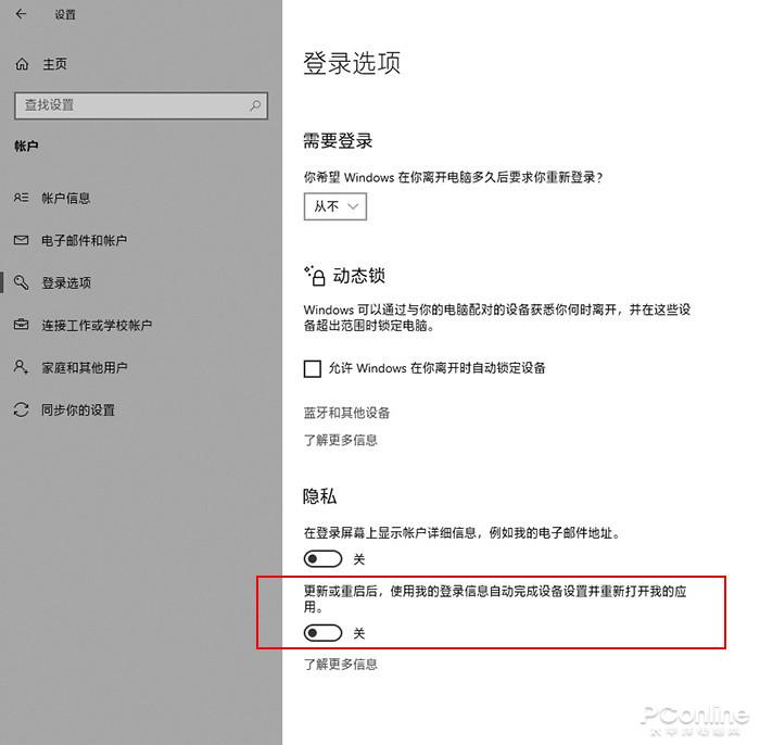 这项设置存在于Windows 10 build 1709以及更高版本中,只不过由于名称太过蹩脚,了解的人不多罢了。其实这项功能的真正用途,是让电脑重启完成后,自动启动先前没有关闭的软件,以便用户快速接续之前的工作。