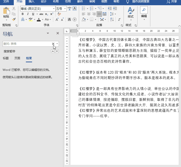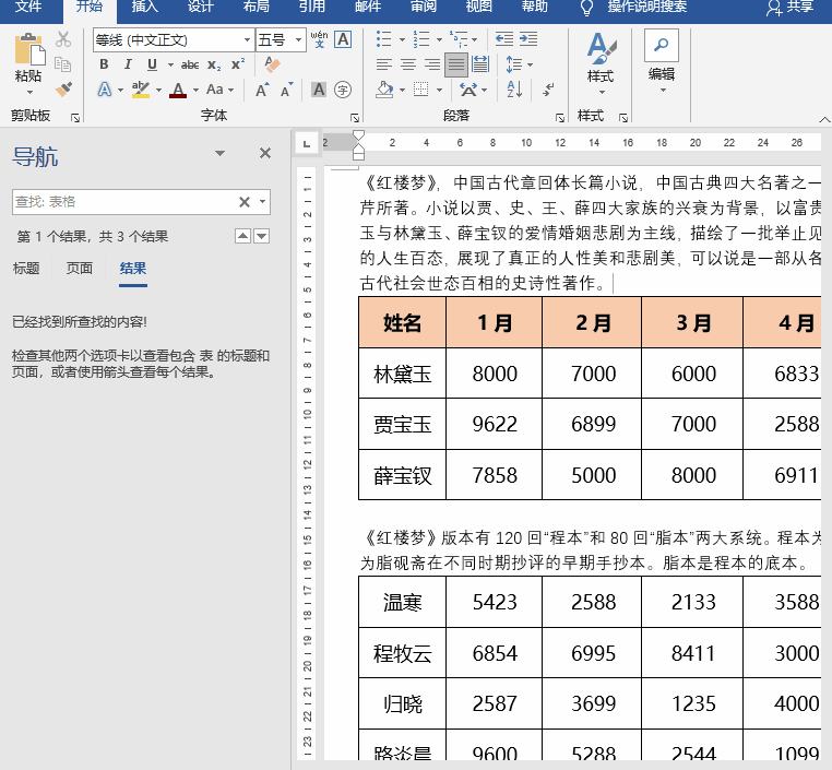 快速查找文档中的所有表格,也可以用【Ctrl+F】快捷键,点开搜索框下的三角按钮,选择【表格】,然后点击上、下三角形按钮,就能够按顺序查找下一个表格。