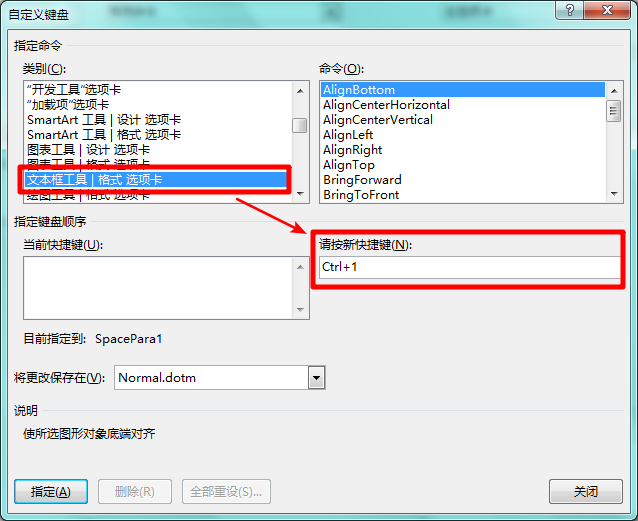 ③在弹出的自定义键盘窗口中,选择一个命令,然后设置对应的快捷键即可。