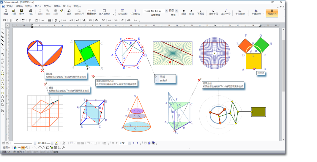 采用自动吸附技术,绘制几何图形过程中,智能提示各种作图操作,方便快捷。绘图过程中智能提示各种特征图形,如:垂线、中线、角平分线、平行线、切线、中位线、交点、中点、等分点等,轻松绘制各种几何图形,并由此创建出各种复杂、蕴含逻辑结构“智能”图形,使几何作图更加直接、方便、快捷,提高作图效率,使用户易于掌握、能够直接上手。