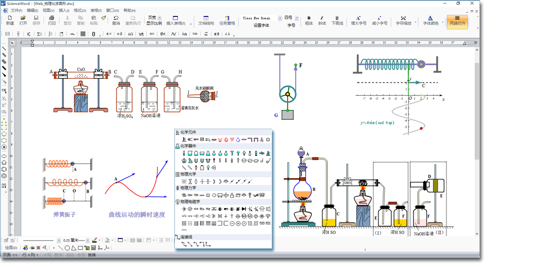 动静结合的物理图形,结构原理一目了然。方便、快捷构建化学实验装置图。基于相关的图形标识图(如:力学、运动学、电学、磁学、光学、热力学、连接线等等)和几何图形绘制,创建各种复杂的物理逻辑图形。