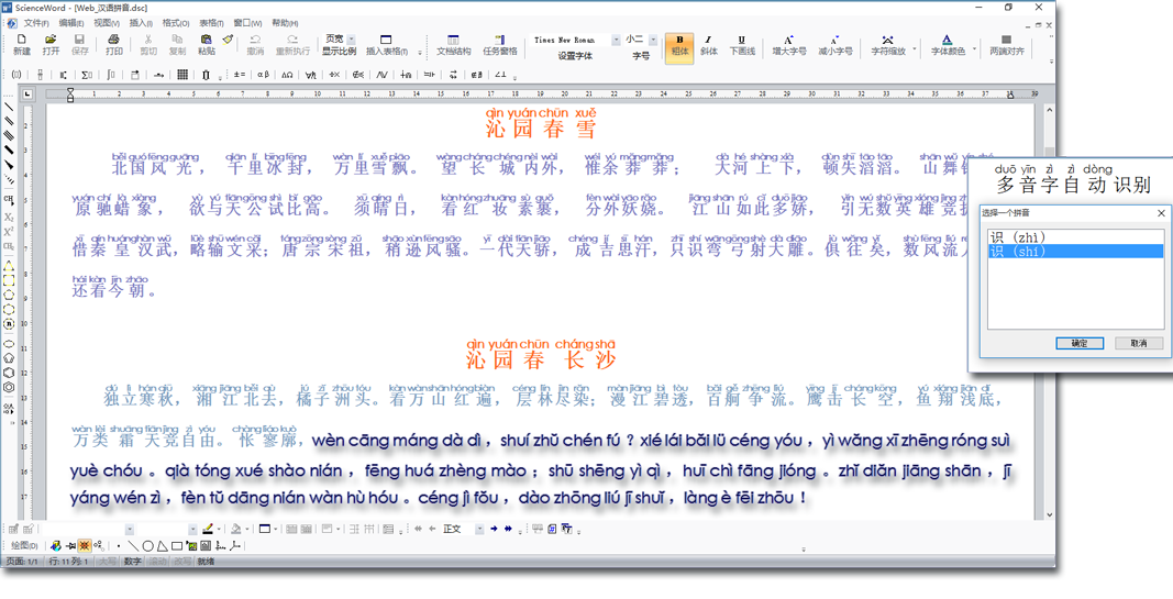 汉字上方自动注音,也可将汉字直接转换成拼音。注音过程中自动识别多音字。
