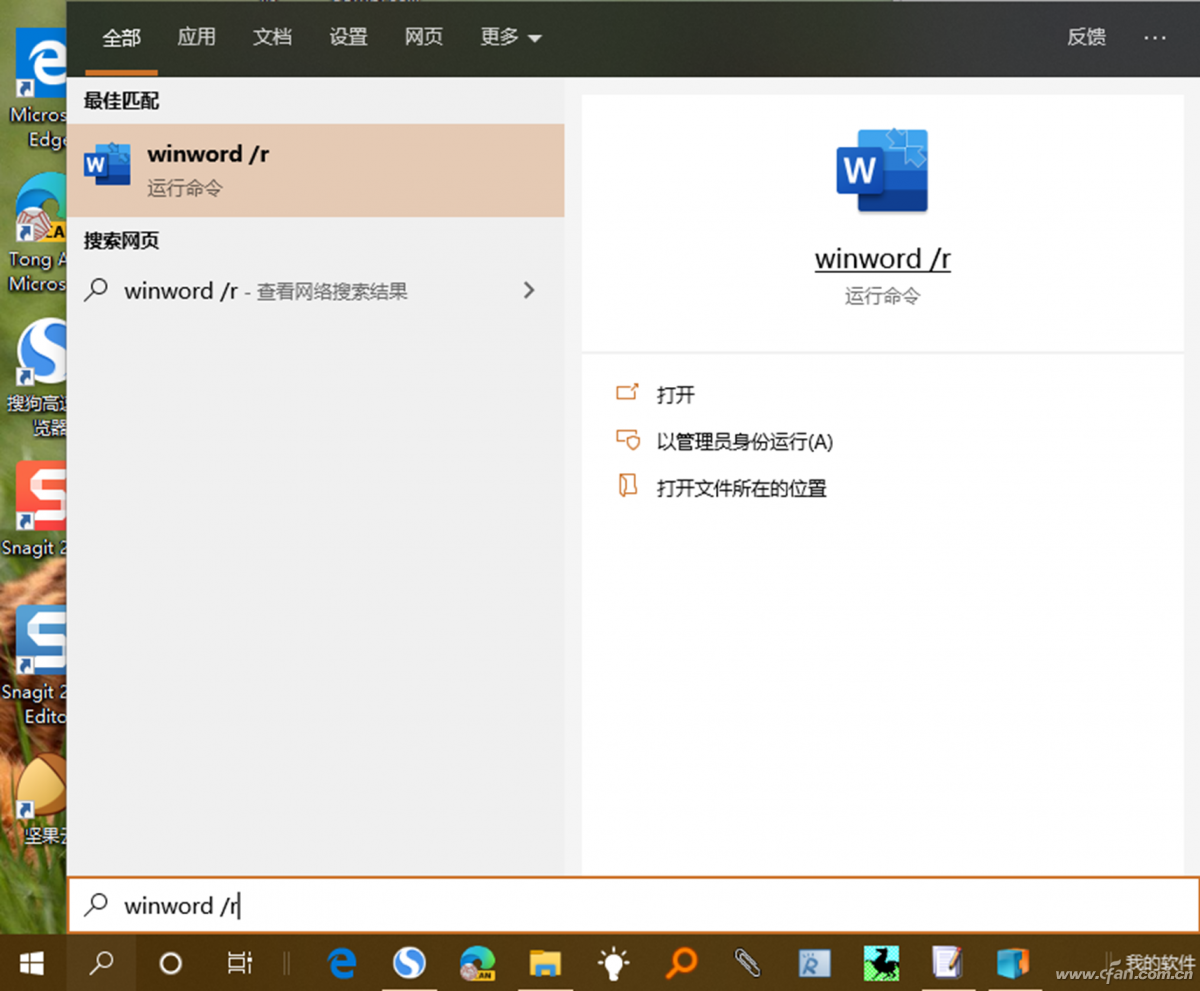 如果提示注册表损坏,只需在Windows 10“搜索”框中键入“winword /r”命令,然后按回车键执行(图3)。这样即可将Word相关注册表值重置为其默认值。