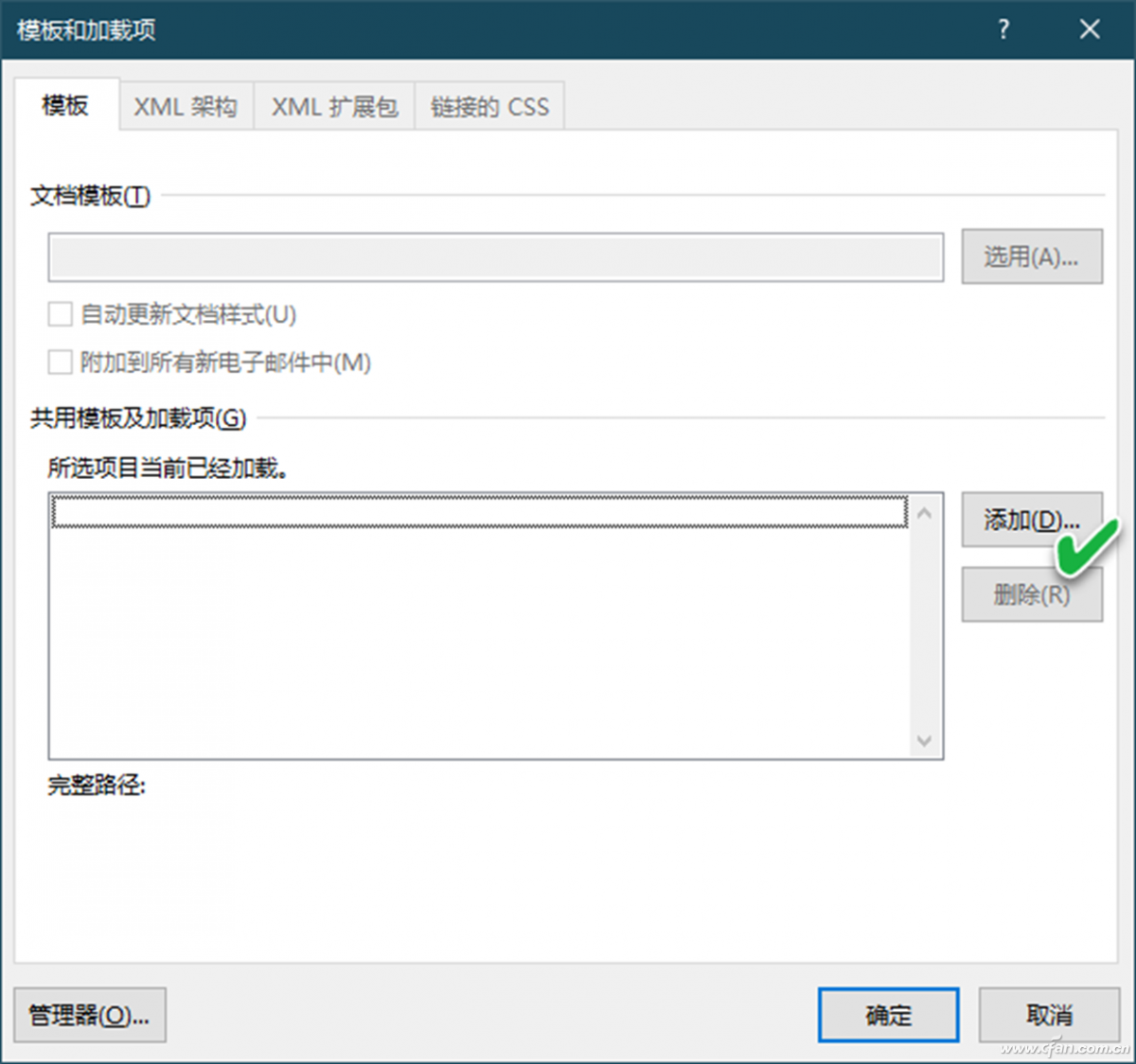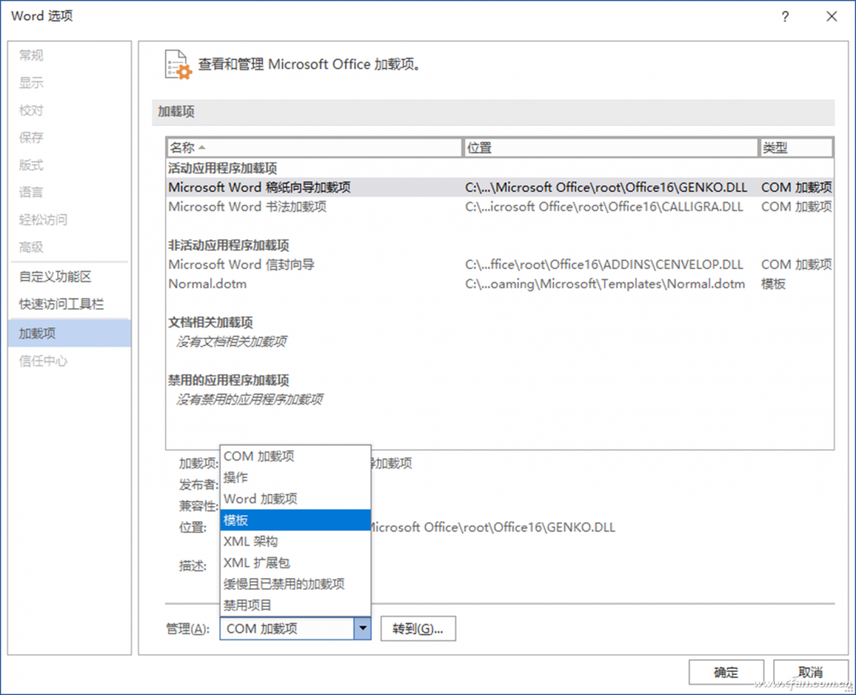 在桌面上右键单击并选择新建一个Word文档,按下Ctrl键之后双击该文档,以安全模式打开此空白文档。点击“文件→选项”菜单命令,依次选择“加载项→管理→模板”(图4)。