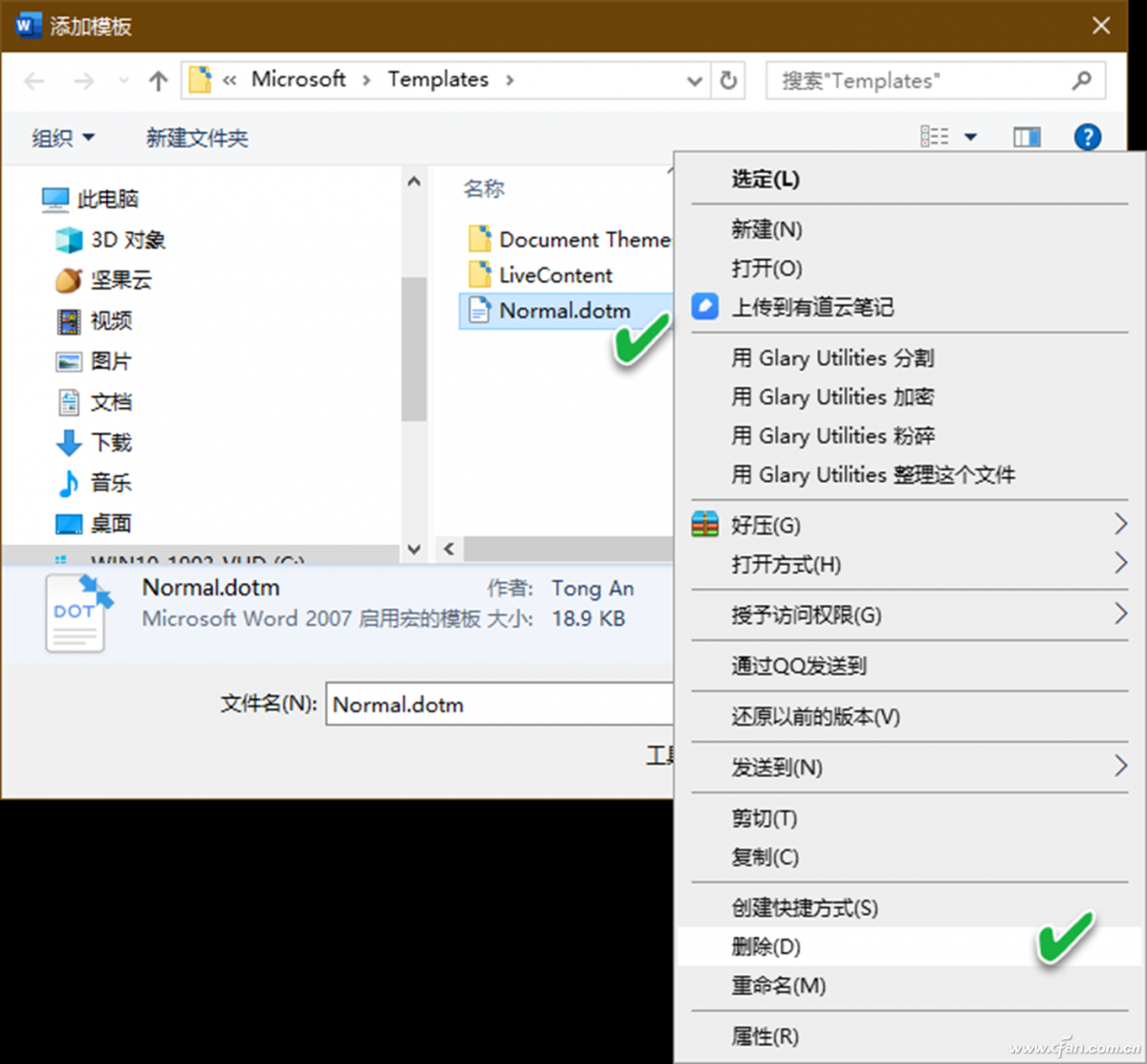 然后,点击“模板”之后的“转到”按钮,当出现“模板和加载项”窗口之后,点击“添加”按钮,选择添加模板(图5)。随后,在弹出的模板选择窗口中,右键单击Normal.dotm文件,选择“删除”即可(图6)。