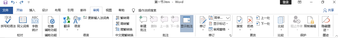 包括校对、语言、中文简繁转换、批注、修订、更改、比较和保护几个组,主要用于对Word 2016文档进行校对和修订等操作,适用于多人协作处理Word 2016长文档。