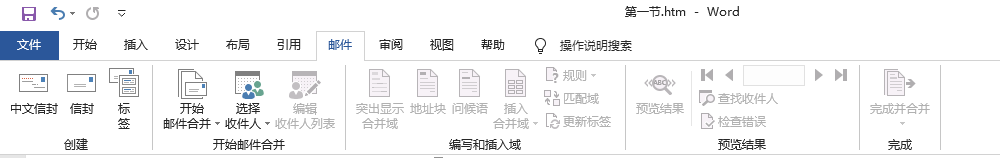 包括创建、开始邮件合并、编写和插入域、预览结果和完成几个组,该选项卡的作用比较专一,专门用于在Word 2016文档中进行邮件合并方面的操作。