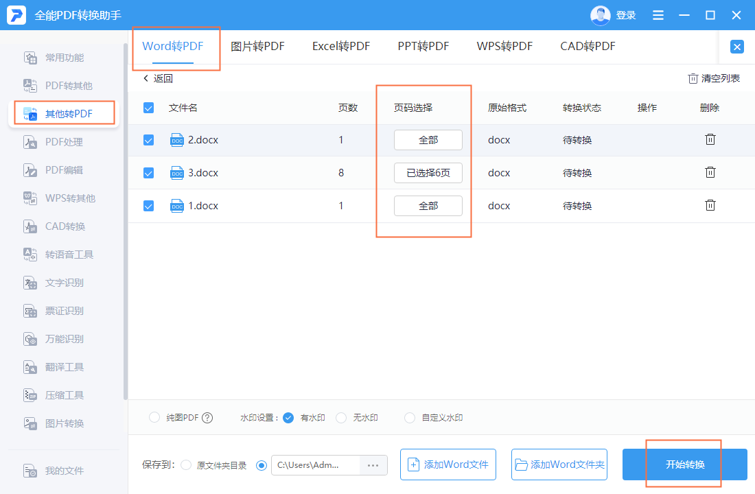我们还可以选择要转换的页面、添加水印等,还能自定义水印内容哦。