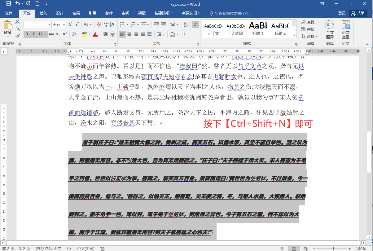 选中文字,按下【Ctrl+Shift+N】即可。