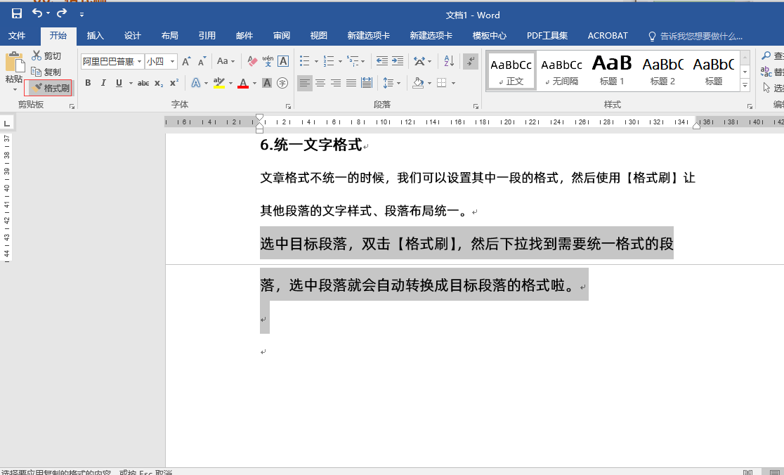 文章格式不统一的时候,我们可以设置其中一段的格式,然后使用【格式刷】让其他段落的文字样式、段落布局统一。