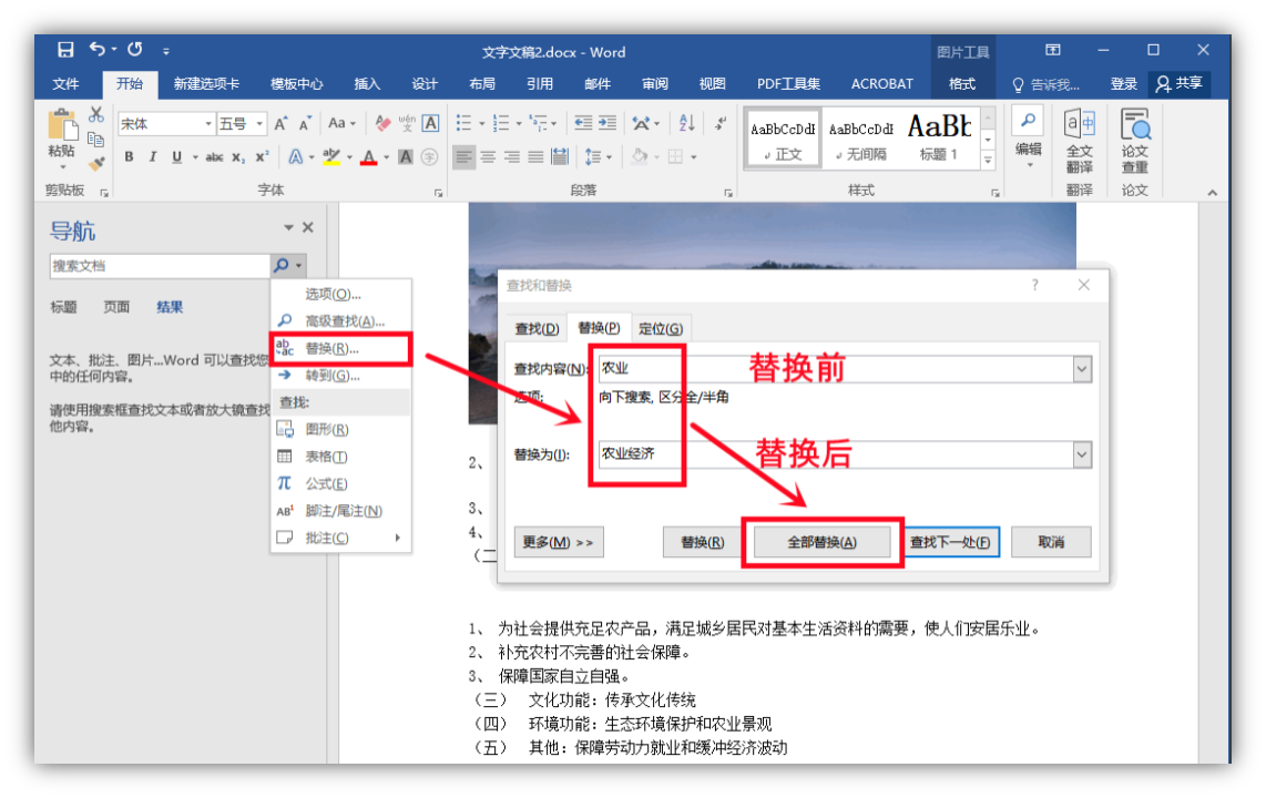 当我们在检查修改文章时,可以通过“查找和替换”工具,一键实现全部替换。按下快捷键【Ctrl+F】打开面板,选择【替换】,输入查找内容和替换内容,再点击【全部替换】即可。