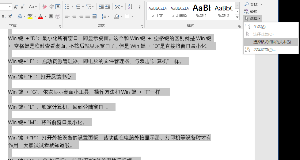 当然,好像很多人都没有留意到,Word里就有选定格式类似文本的功能,选择后直接修改格式就可以了~