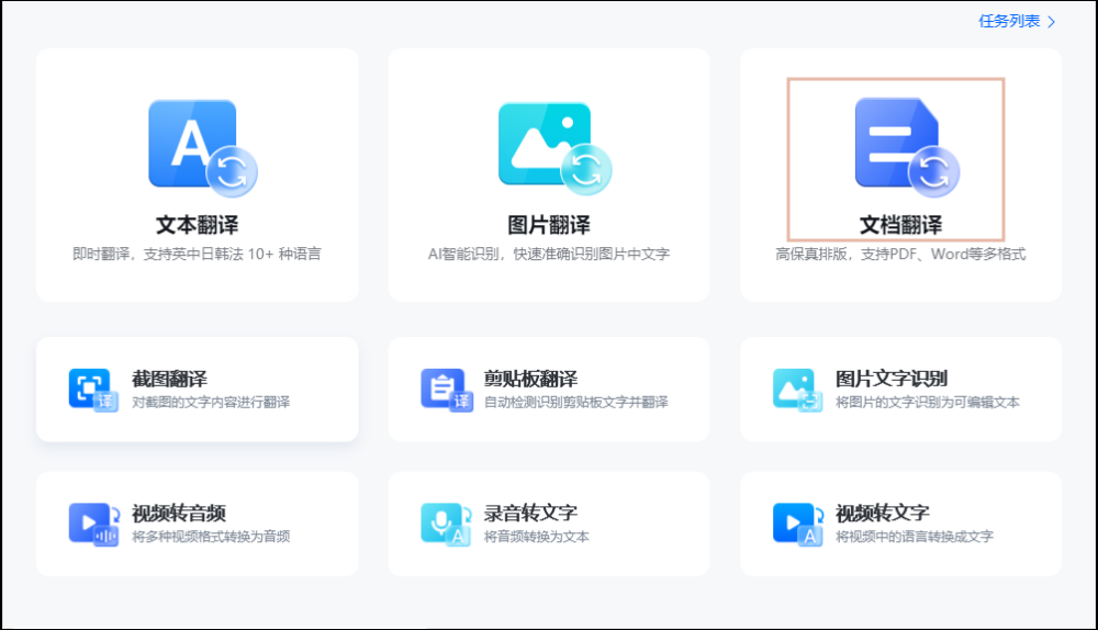 第一步:如下图所示,选择页面中的【文档翻译】。PDF、Word等格式的文档都支持翻译。