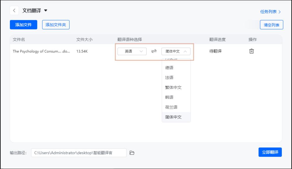 第三步: 这个时候大家就可以依据自己想要翻译的语种设置翻译语言了,然后设置文档翻译后结果的保存位置。接着点击【立即翻译】就可以了。