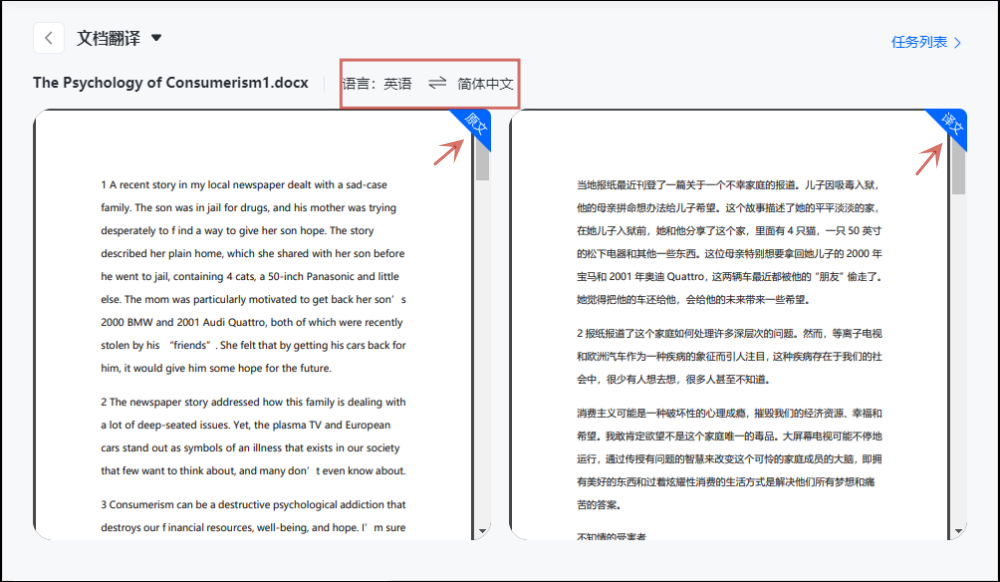 翻译完成后的结果直接与原文对照查看,非常清楚。