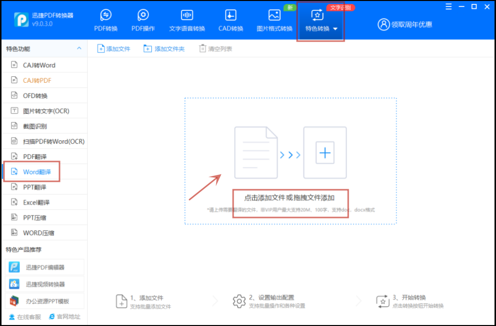 第一步:单击【Word翻译】,点击添加需要翻译的Word文档。