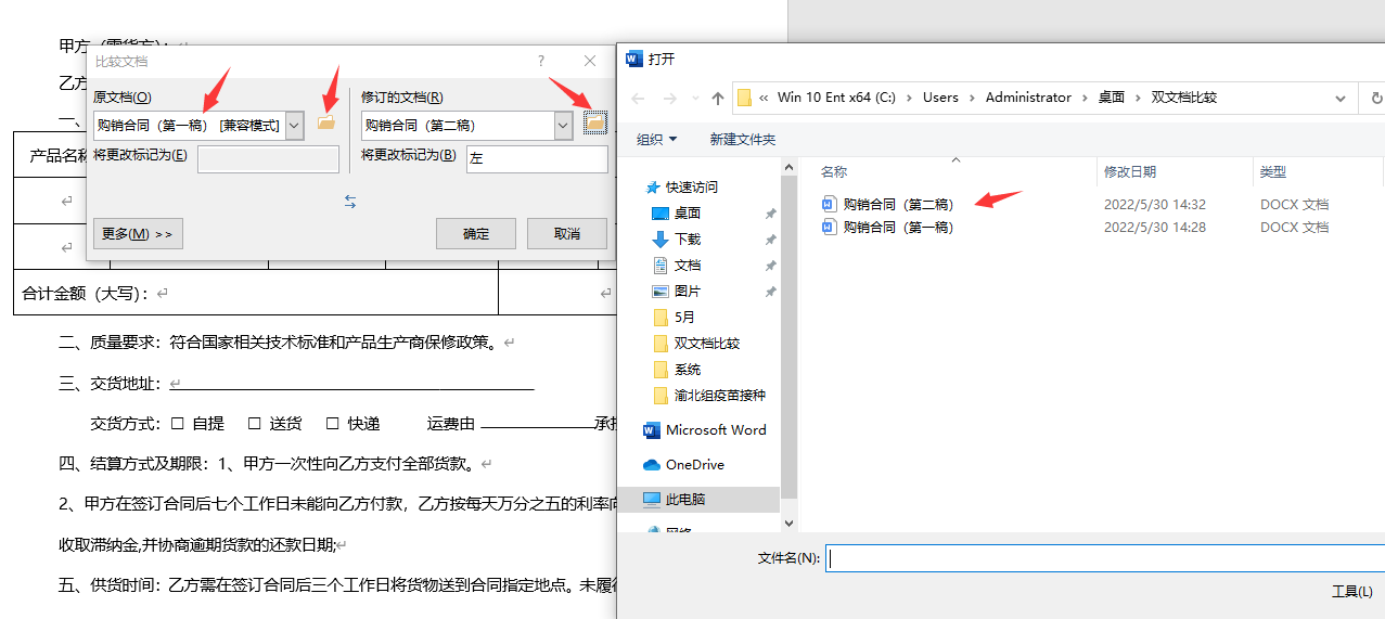 メ比较文档弹窗中,分别添加两个word文档,点击确定。メ