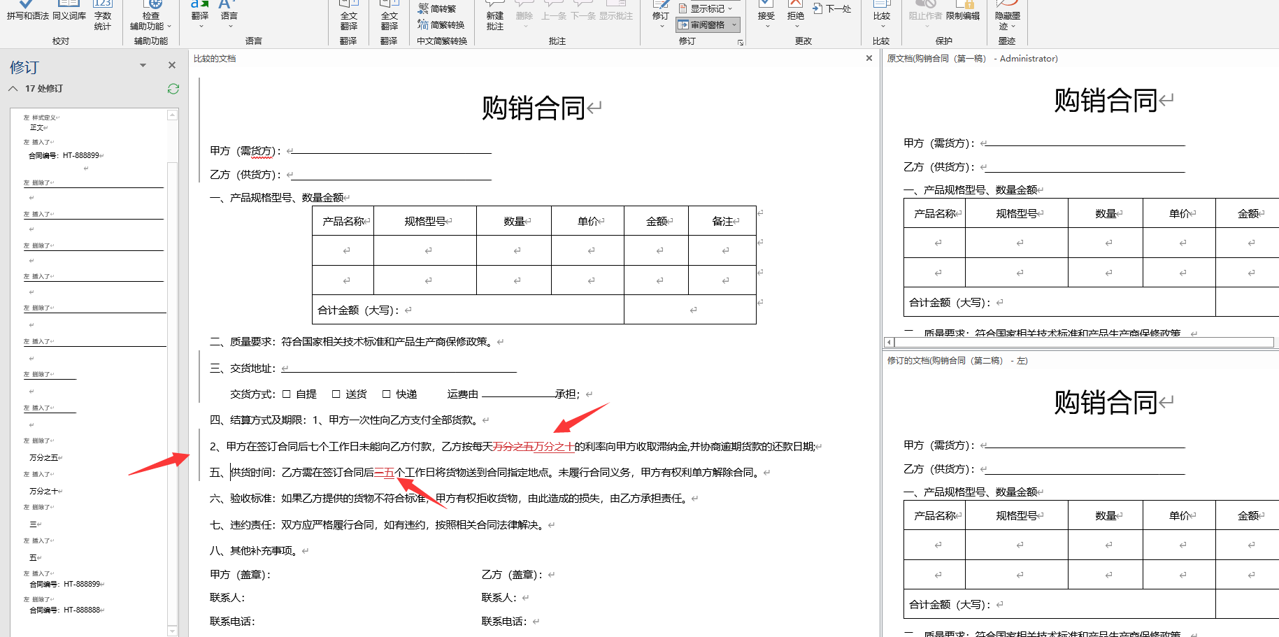 メ一键显示双文档比较结果,第一版和第二版不同之处,在左侧修订栏中显示,文档内的竖红线则为有修改行。メ