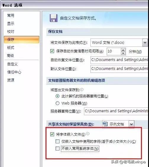 想要在另一台电脑上打开此文档时保持字体格式不变,我们可以在另存为或者保存文档的时候,进入“保存选项”,选择“将字体嵌入文档”,这样就可以把创建此文档所用的字体和文档保存在一起,当我们在另一台电脑上打开文档时,仍可用这些字体查看或打印。