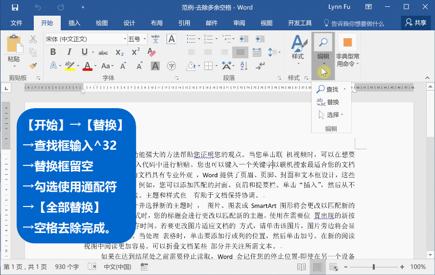这时候我们在Word文档菜单栏中点击“开始”,然后在工具中找到并点击“编辑”,选择“替换”,在框内输入“^32”,点击“更多”,勾选“使用通配符”,最后点击“全部替换”即可自动删除多余的空格。